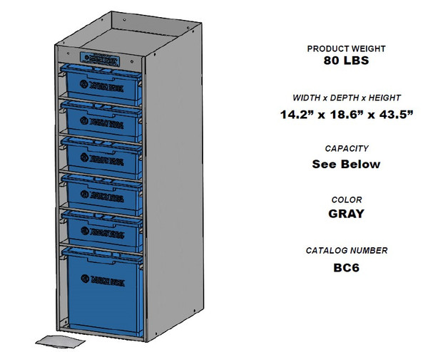 Cabinet features 5 Shallow Bins and one Deep Bin in a vertical stack with a flanged top shelf.