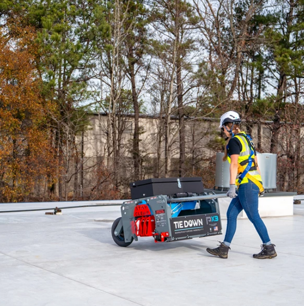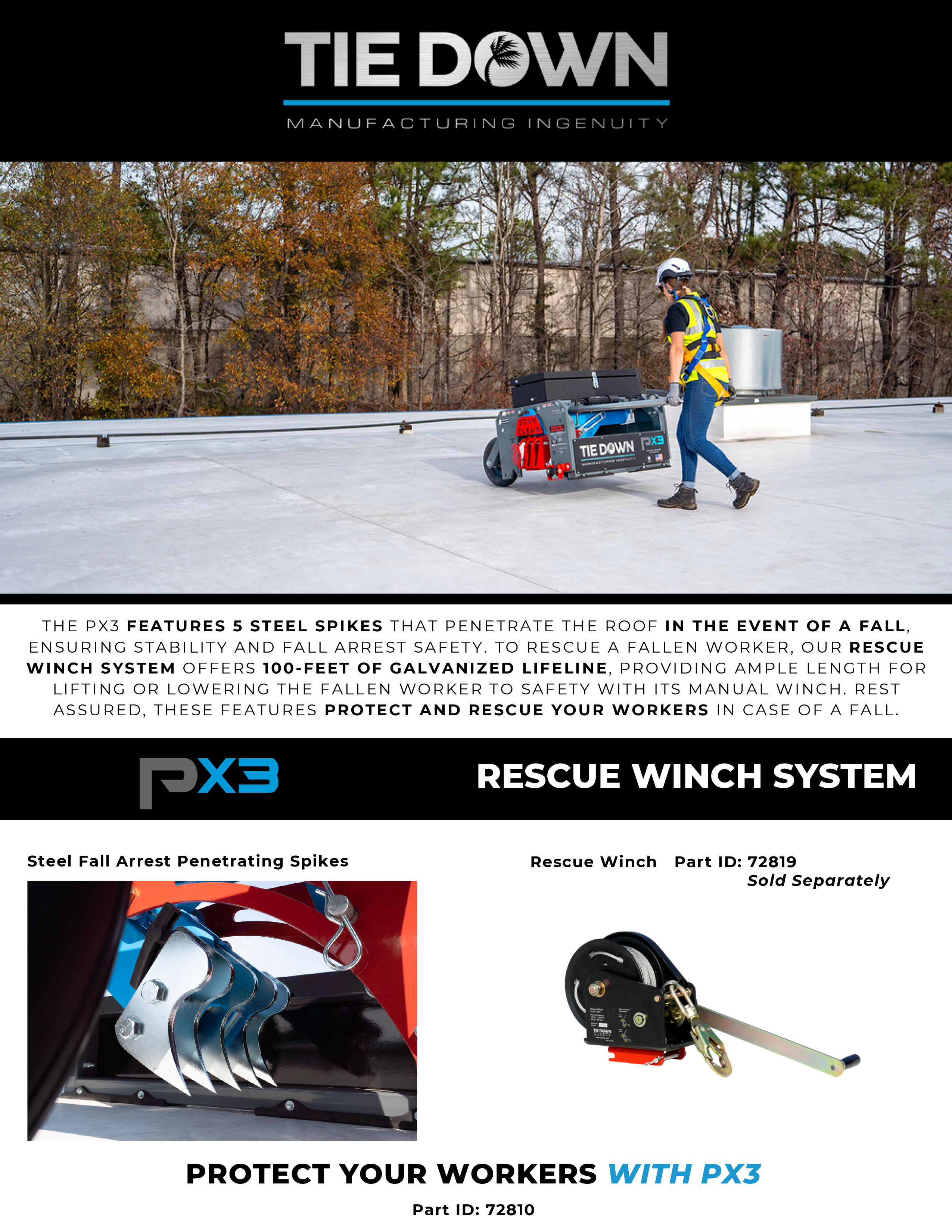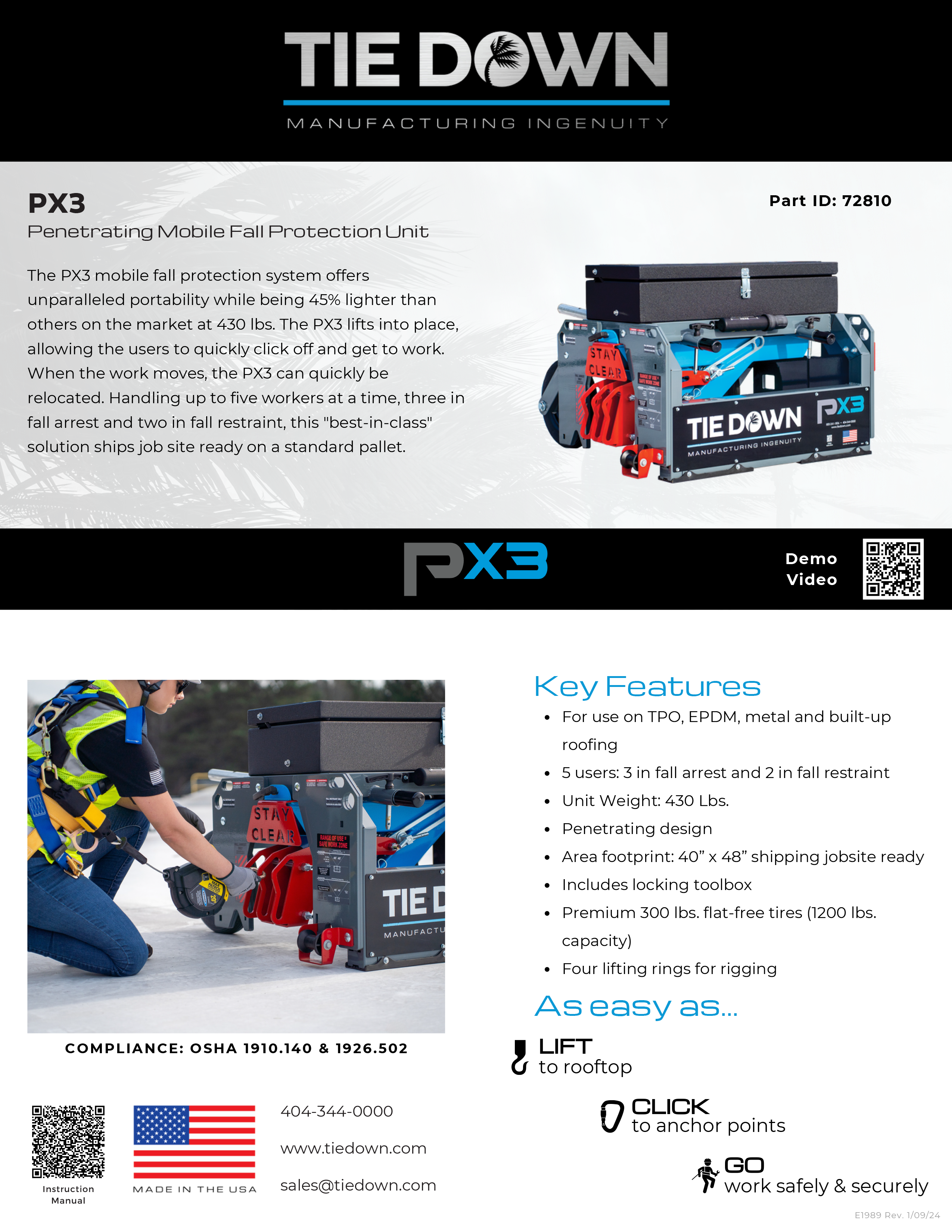 Tie Down's PX3 mobile fall protection system offers unparalleled portability while being 45% lighter than others on the market at 430 lbs. The PX3 lifts into place, allowing the users to quickly click off and get to work. When the work moves, the PX3 can quickly be relocated. Handling up to five workers at a time, three in fall arrest and two in fall restraint, this "best-in-class" solution ships job site ready on a standard pallet.