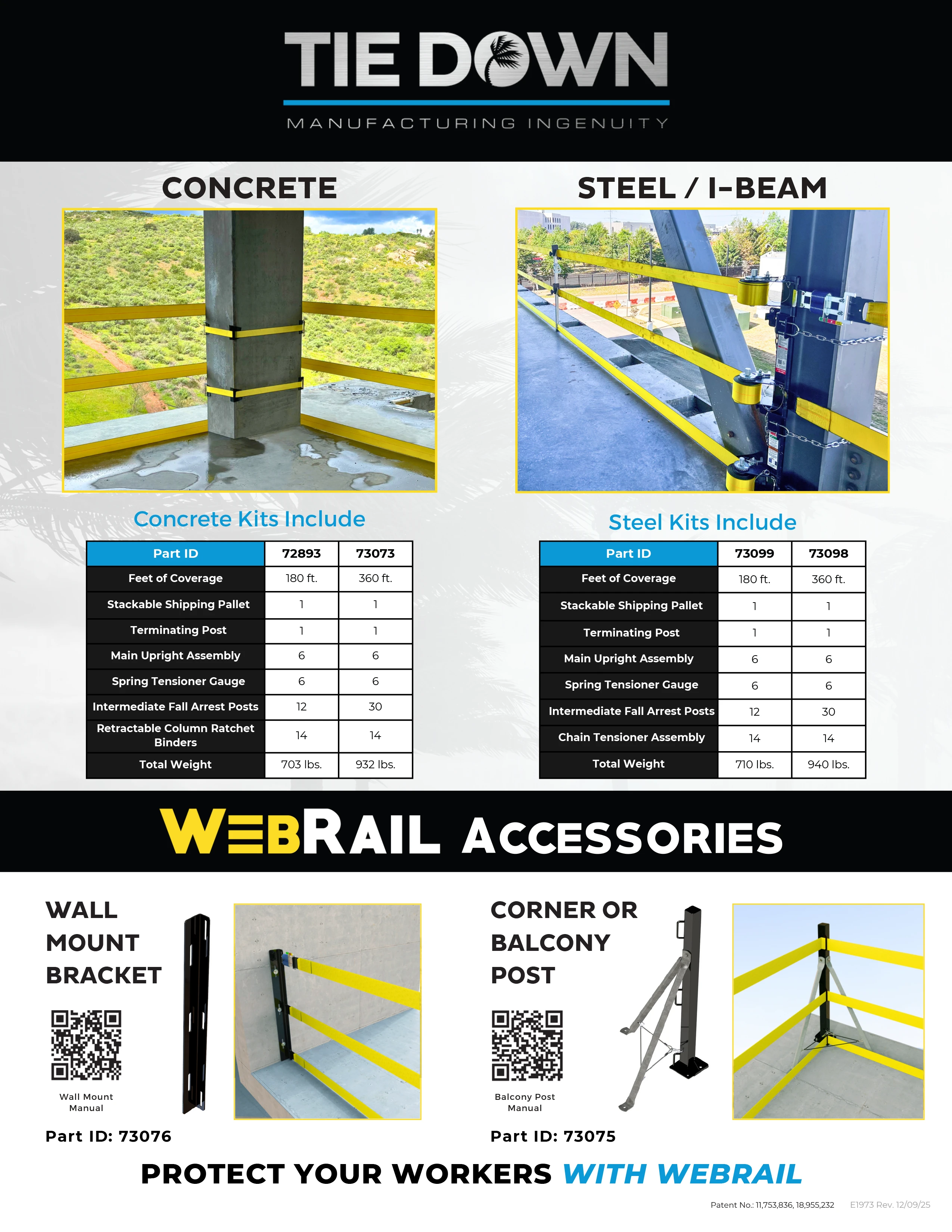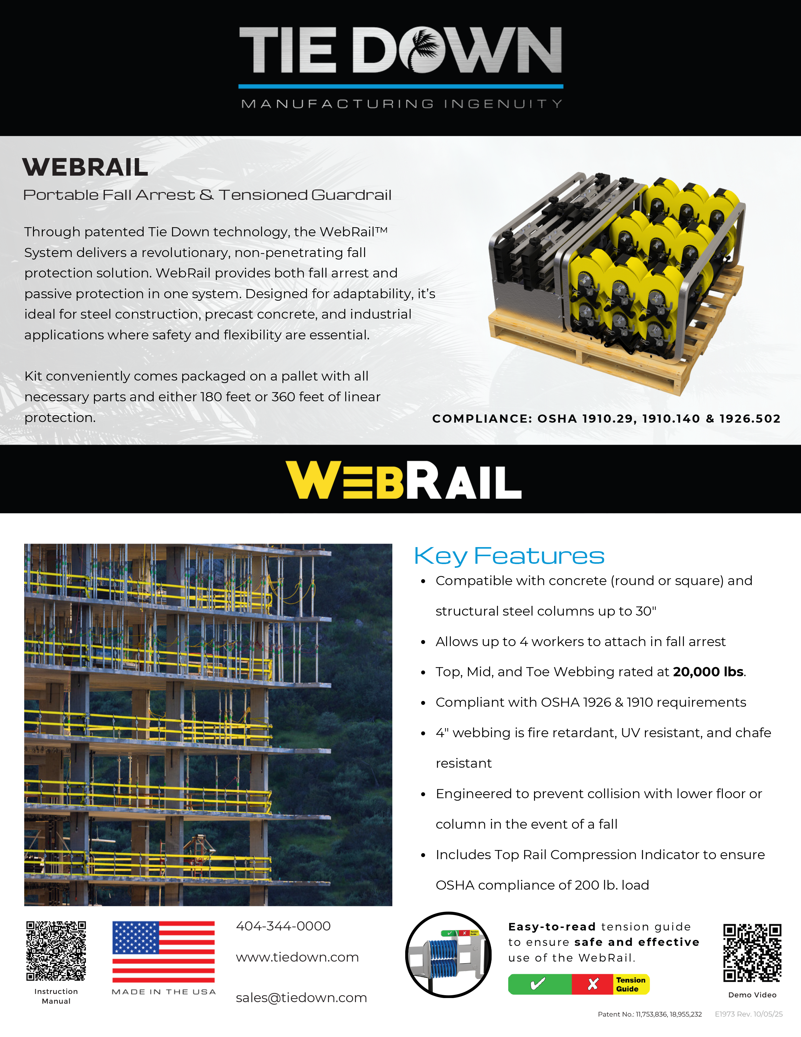 Tie Down's 30 ft. WebRail represents a revolutionary advancement in fall protection due to its patented technology that offers both fall arrest and passive protection without penetrating the structure. This kit conveniently comes packaged on a pallet with all necessary parts for 180 feet of linear protection. The WebRail kit attaches to the WebRail vertical fall arrest support rather than the building column, ensuring that in the event of a fall, workers are prevented from colliding with the floor or column. With an impressive capacity for up to four users in fall arrest per single span of webbing, the top, mid, and toe webbing is rated at an impressive 20,000 lbs., exceeding OSHA 1926 and 1910 requirements. The 4 in. webbing is fire retardant, UV-resistant, and chafe-resistant, ensuring durability and longevity. Versatile and accommodating, it is designed for use with both round and square columns, offering adaptability to various structures. This WebRail is an integral component of a fall protection system, compatible with lanyards or SRL vertical fall protection lifelines, providing comprehensive safety assurance on the job.
