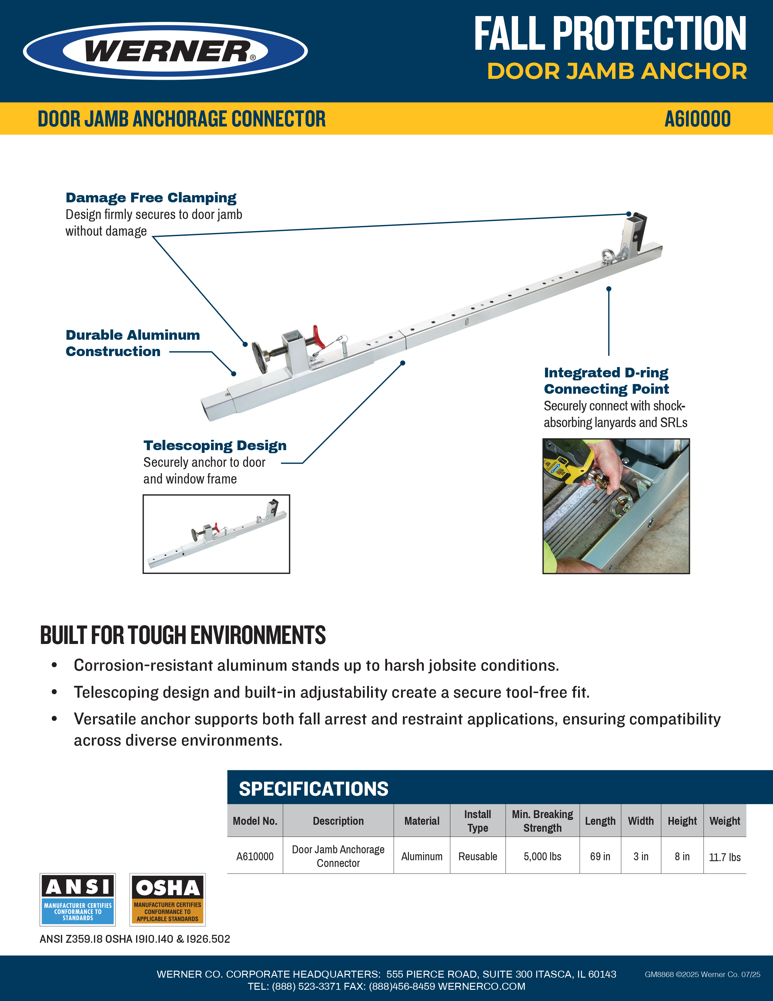 The Werner A610000 Door Jamb Anchor is designed to securely attach to door or window frames ranging from 20 to 59 inches without any tools or the worry of marring. The Door Jamb Anchor offers adaptability for various job site needs.